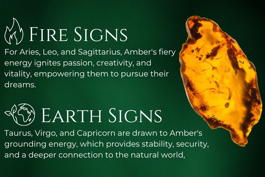Earth signs like Taurus, Virgo, and Capricorn are drawn to Amber’s grounding energy, which provides stability, security, and a deeper connection to the natural world, helping them to manifest their goals with practicality and perseverance.