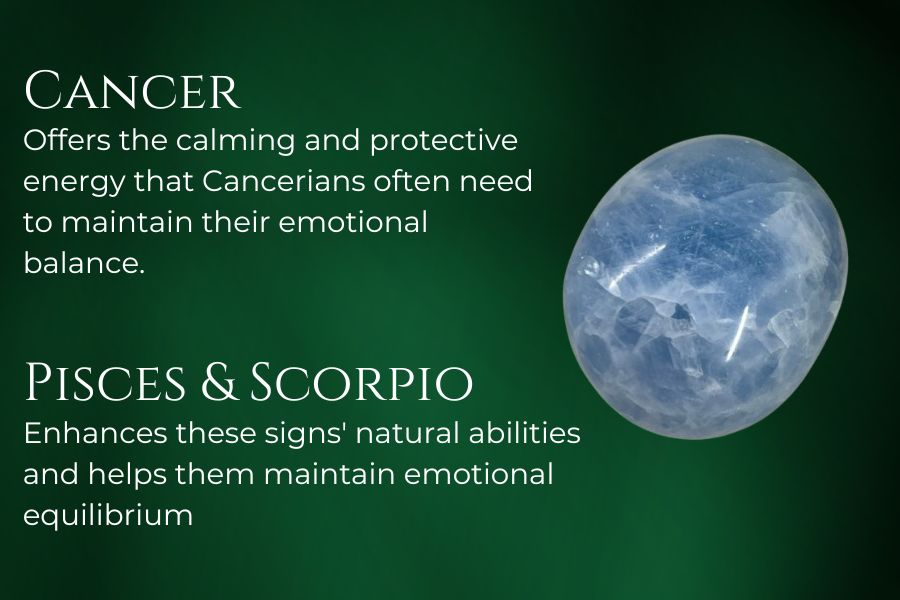While Cancer is the primary zodiac sign associated with Blue Calcite, it can also benefit other water signs like Pisces and Scorpio, who are similarly emotional and intuitive, with these signs using Blue Calcite to enhance their natural abilities and maintain emotional equilibrium.